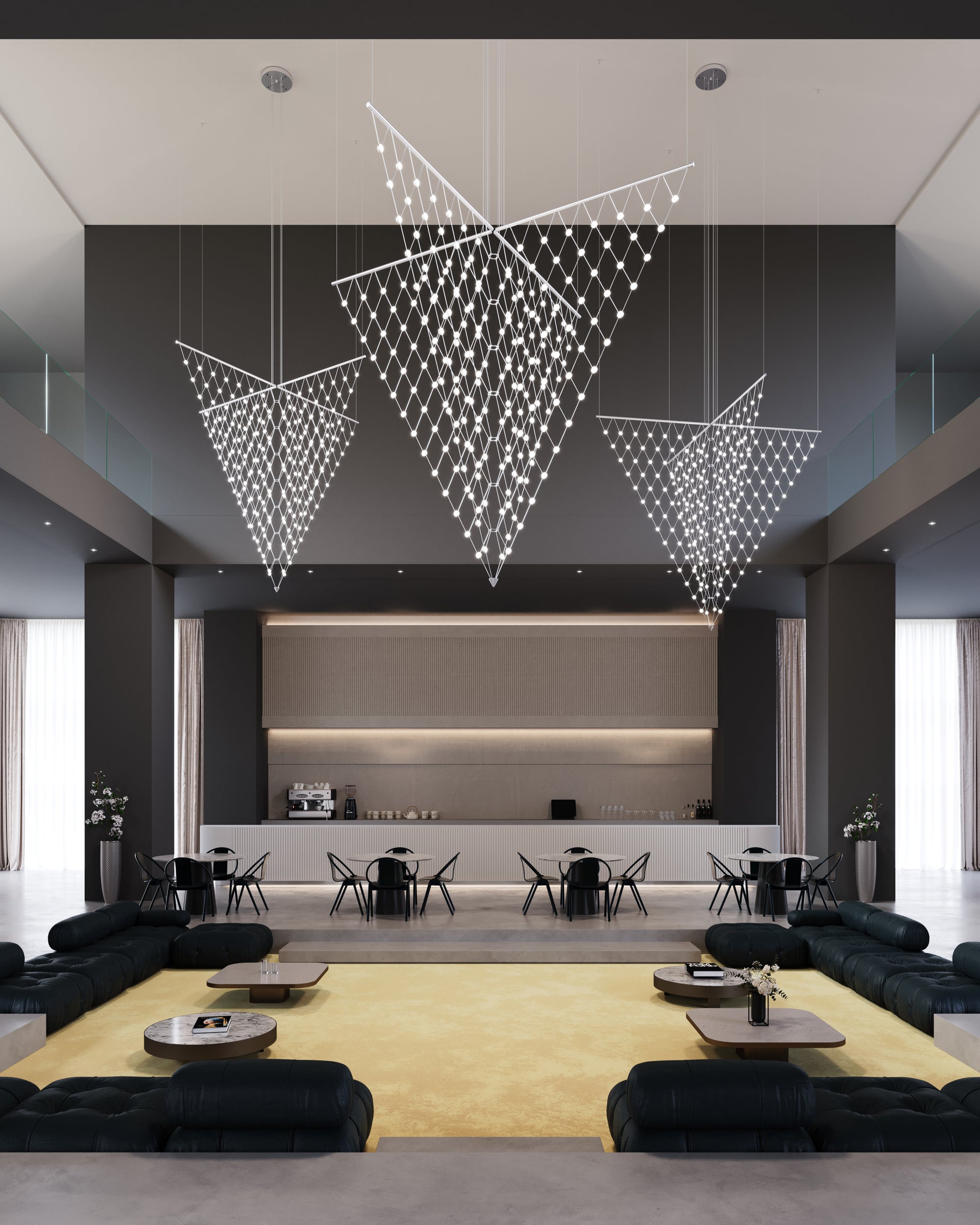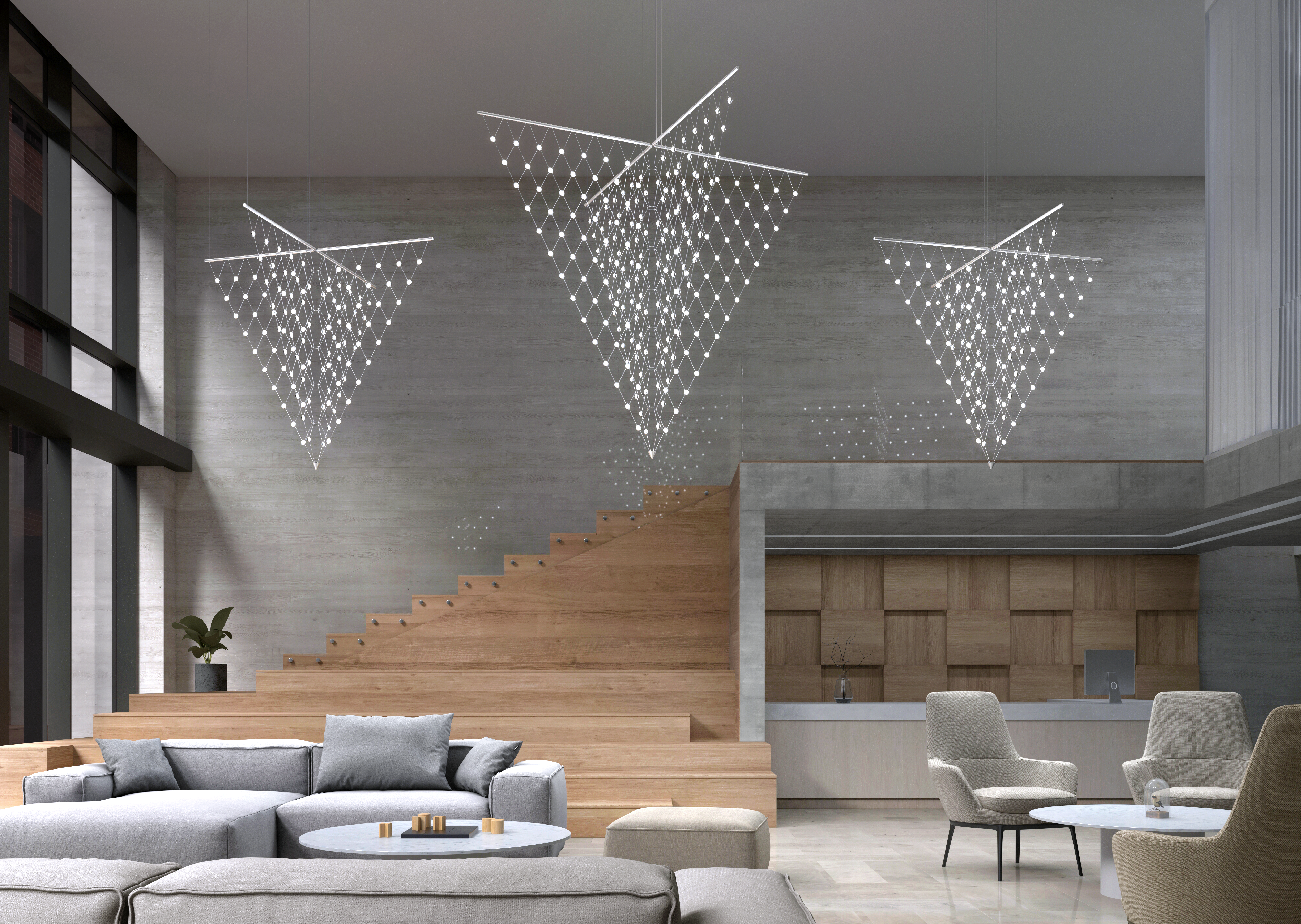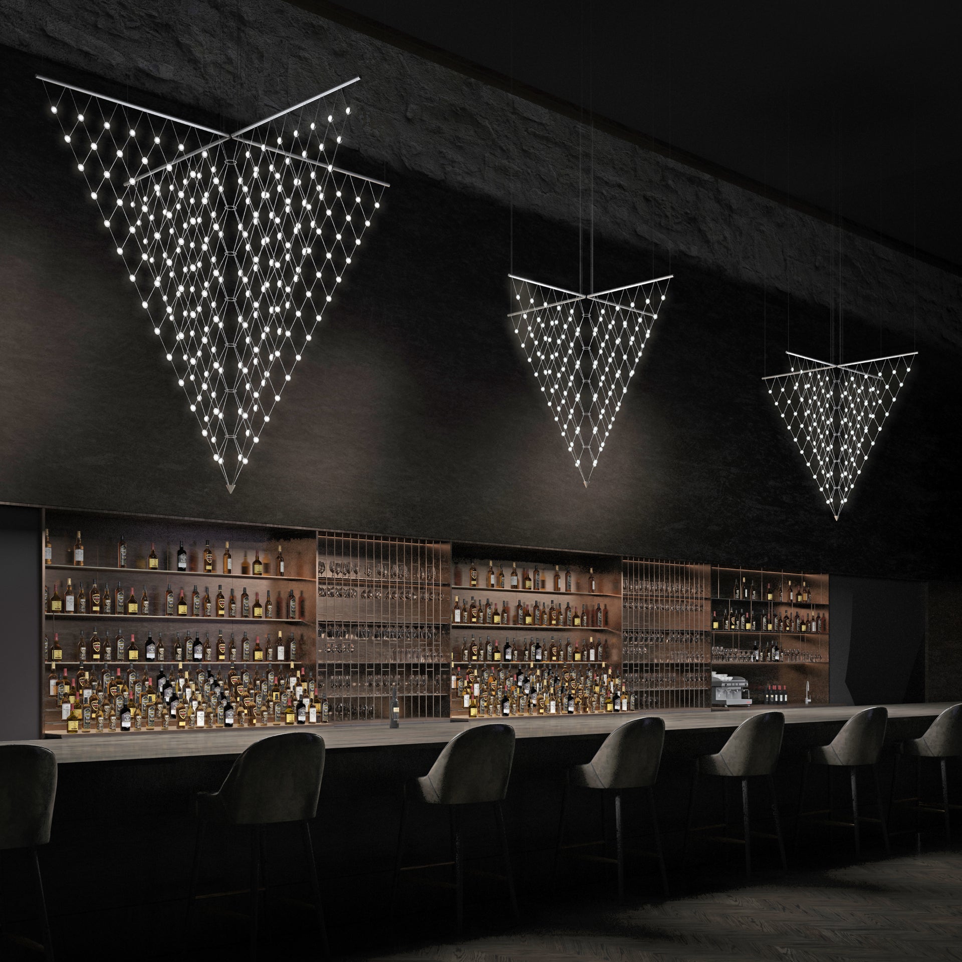 LED hubs connected in linear strands of various lengths are suspended to form dramatically powerful luminance within a vertical space. Available in a variety of sizes and configurations, with lens options of crystal facets or soft white, Constellation Andromeda can also be customized for your project.