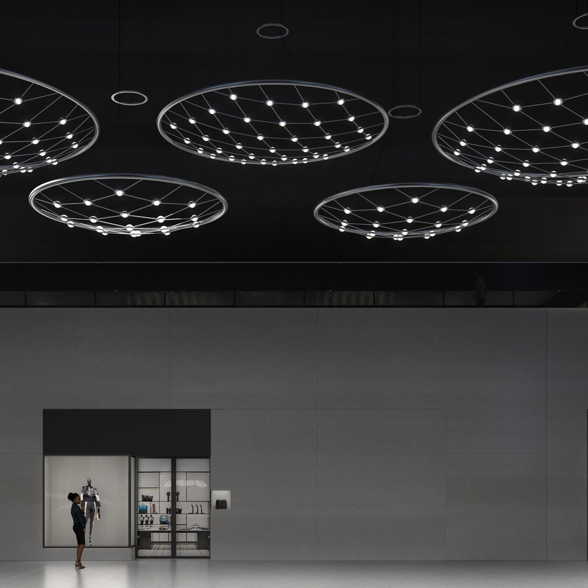 LED hubs connected in linear strands of various lengths are suspended to form dramatically powerful luminance within a vertical space. Available in a variety of sizes and configurations, with lens options of crystal facets or soft white, Constellation Andromeda can also be customized for your project.
