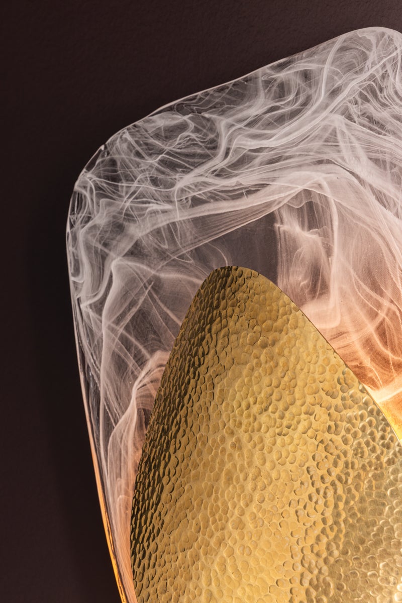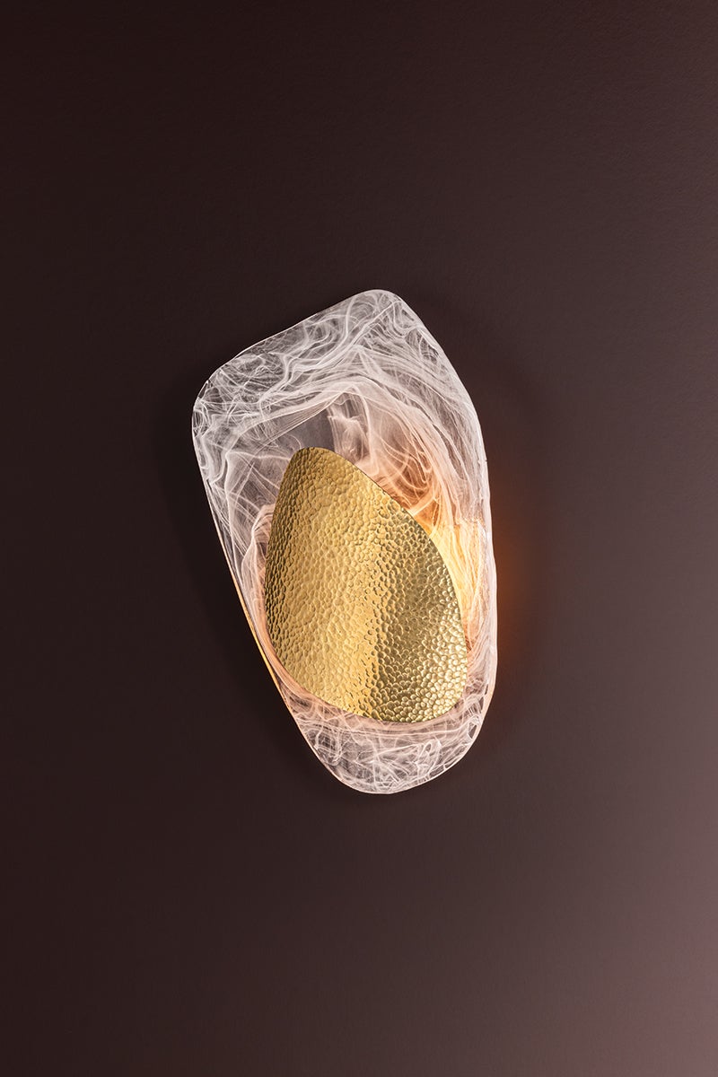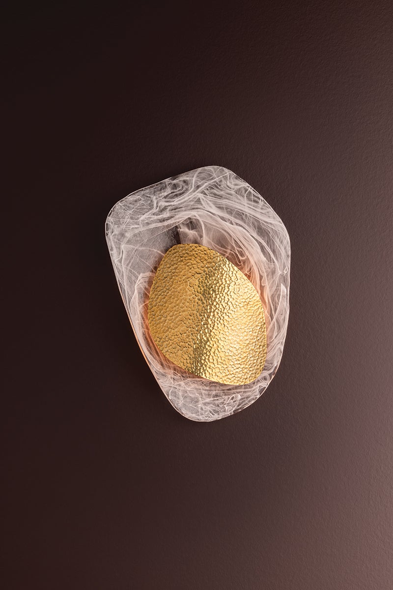 Dynamic design lines and layered materials combine in the eye-catching composition of Bilbao. This artful sconce pairs delicate cast Piastra glass with a hammered Vintage Brass abstract form, creating a luxurious contrast. As it gently curves away from the wall, Bilbao breathes life into a space with its vaguely botanical beauty.